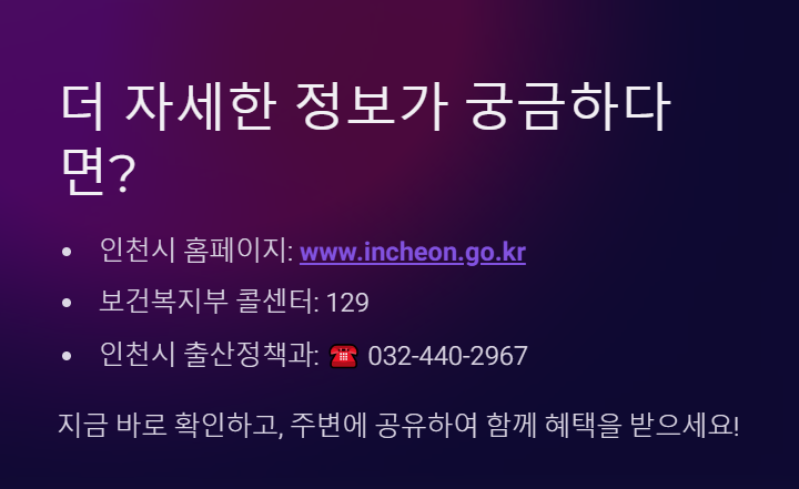 - 인천시 외에도 각 구청별 추가 지원금이 있을 수 있어요. 거주지 구청 홈페이지를 꼭 확인하세요!