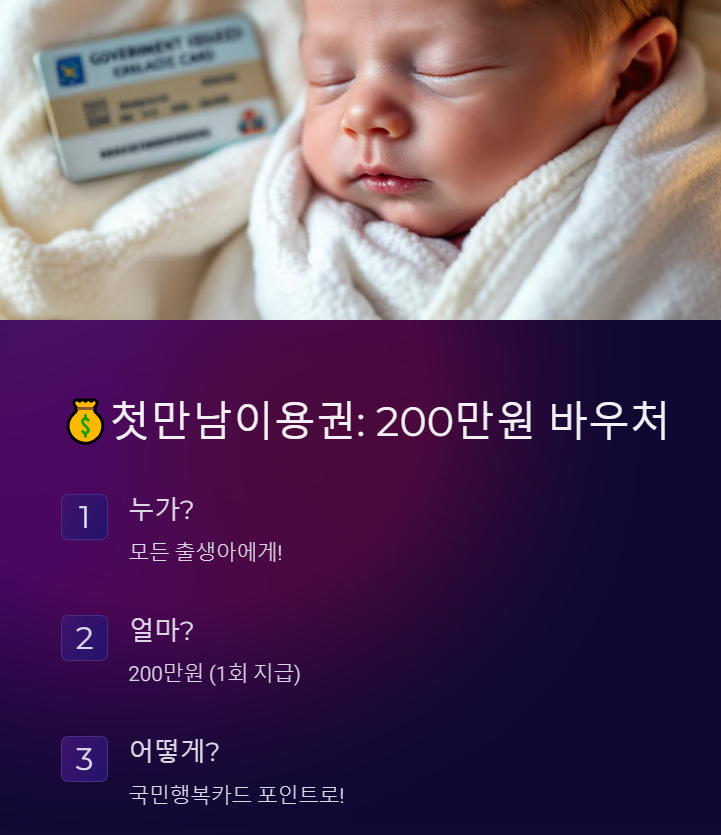 아이 출생 시 한 번 지급되는 지원금으로, 첫째는 200만 원, 둘째부터는 300만 원이 지급됩니다.