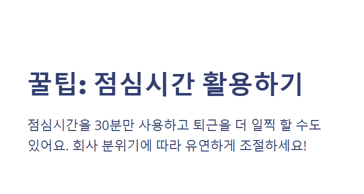 예를 들어, 점심시간을 원래 1시간 쓰는 게 아니라 30분만 쓰고, 그 대신 퇴근을 더 일찍 할 수도 있어요.