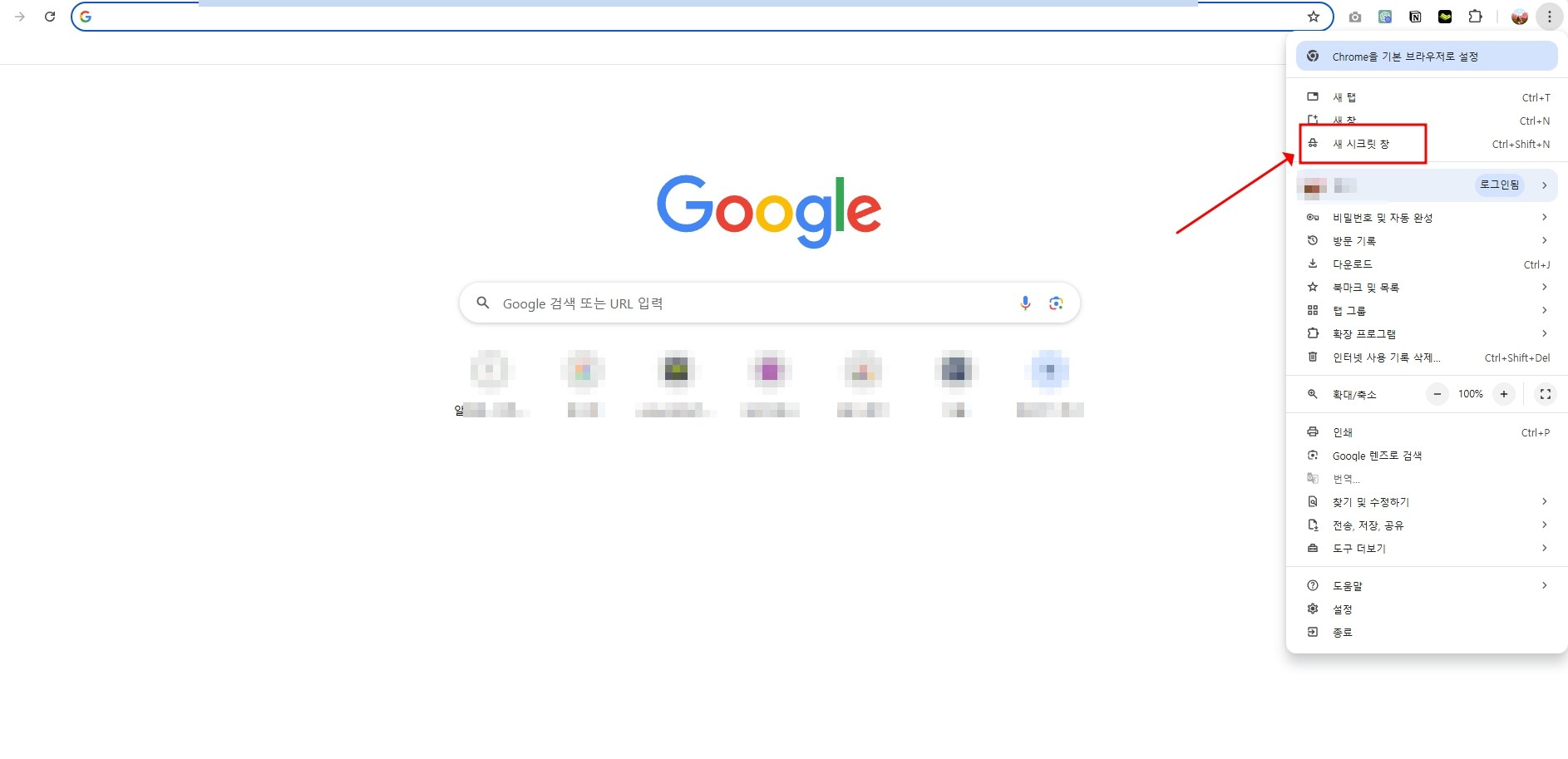 크롬 브라우저를 기준으로 보면, 오른쪽 상단의 점 세 개를 클릭한 후 ‘새 시크릿 창’을 열면 되는데요.