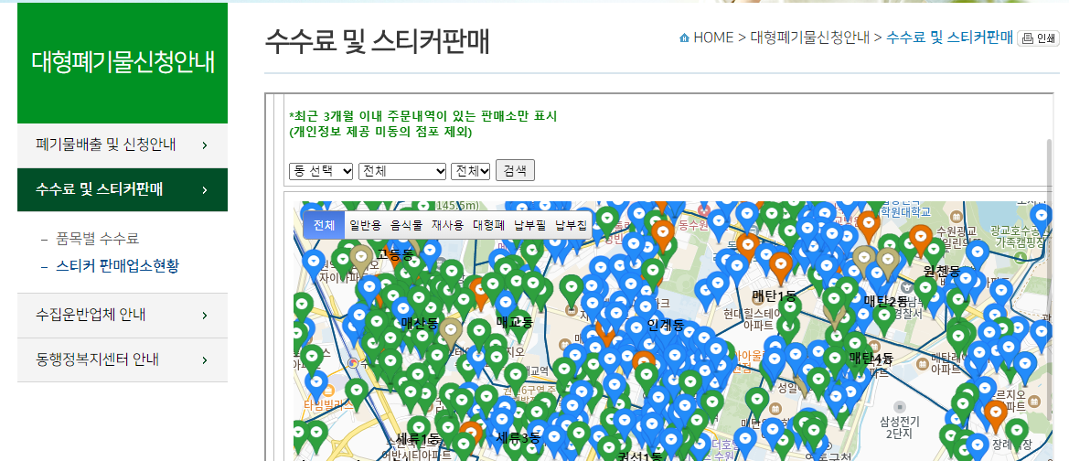 - 폐기물 종류(소파, 장롱, 매트리스 등)를 선택하면 수수료가 자동 계산됩니다.