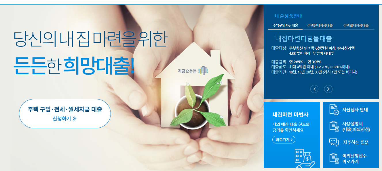 • 기금e든든 또는 은행(국민, 신한, 우리, 하나, 기업은행 등)에서 신청할 수 있습니다.