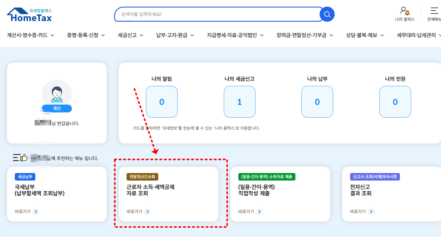 1️⃣ 홈택스 로그인 후 "연말정산 간소화" 메뉴 접속