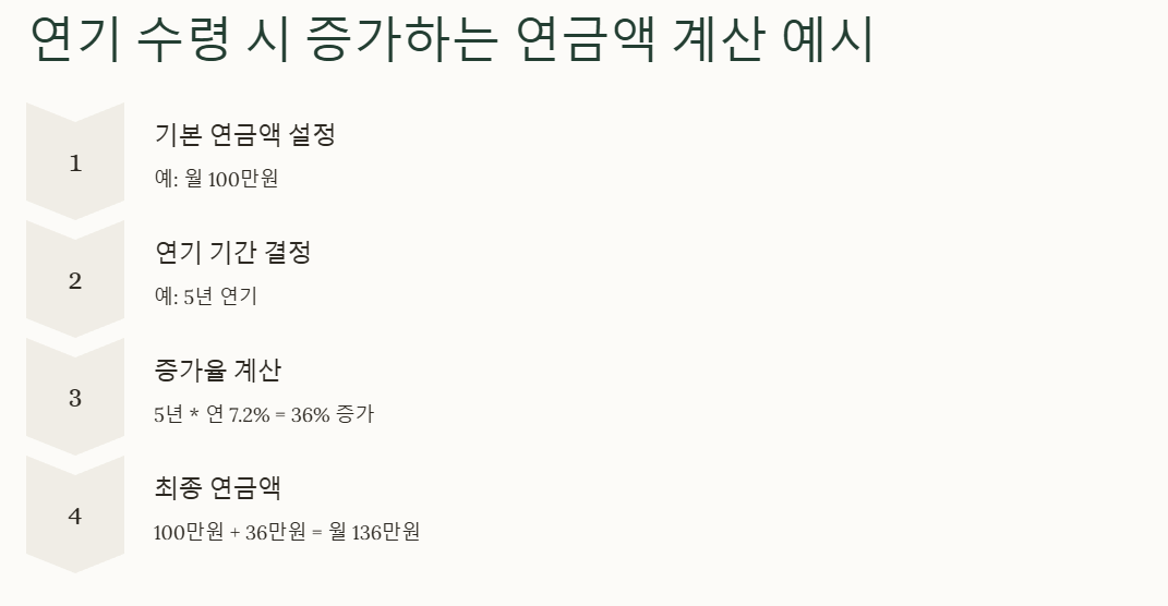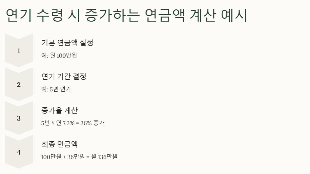 예를 들어, 65세에 월 100만 원을 받을 수 있는 사람이 5년 연기하면 월 136만 원으로 증가합니다.