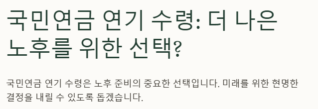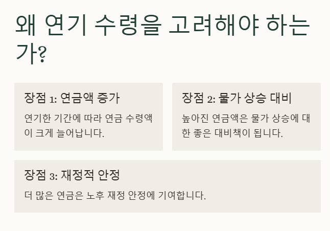 - 현재 다른 소득원이 있어서 당장 연금이 필요하지 않다면, 연기하여 연금액을 늘리는 것이 유리합니다.