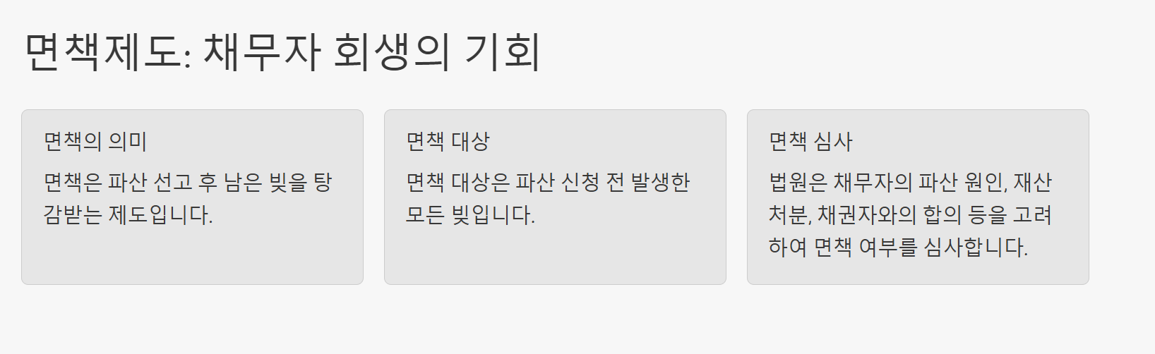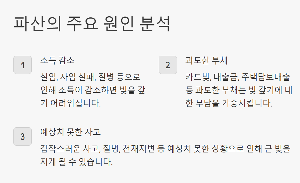 - 개인파산: 보유한 재산을 처분해 채무를 변제하고, 남은 채무를 면책받는 제도 (소득이 거의 없는 경우에 적합)